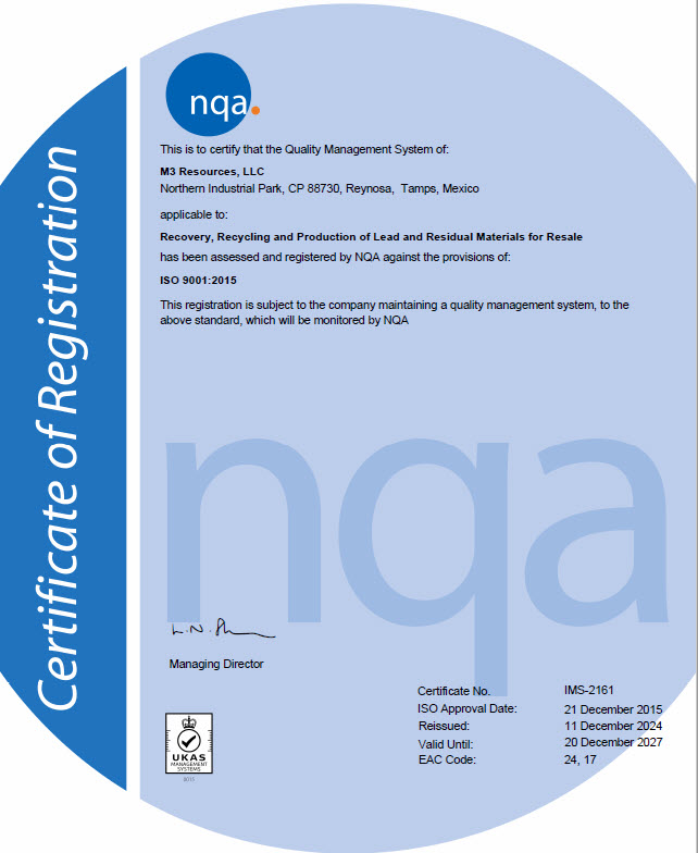 M3 Resources is fully permitted by Semarnat under authorization 28-IV-23-07 . Semarnat is the environmental governing body of Mexico (Mexico’s EPA). The US EPA Acknowledgement of Consent’s (AOC) can be viewed below. The AOC acknowledges joint permitting and approval by Semarnat and the EPA for M3 to export lead acid batteries to our plant in Mexico for recycling.